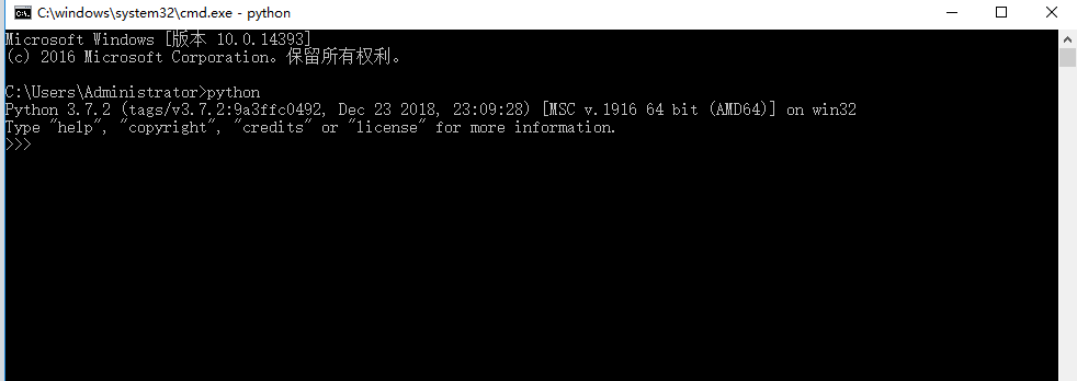 出现如上界面,说明python安装成功。同时进入了python交互式环境中,此时可以输入python代码,回车即可得到执行结果。输入exit()并回车,即可退出python交互环境。