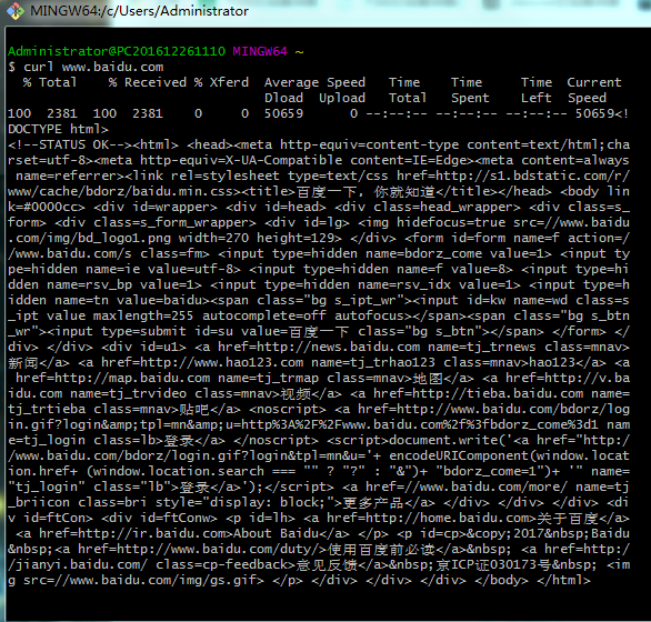 curl 在linux、mac系统中是自带的,windows中推荐使用下载 安装 git for windows,其中附带了curl工具,安装后点击Git Bash,比如输入下面可以下载百度页面。