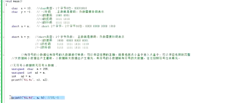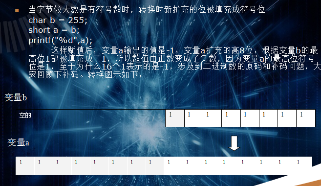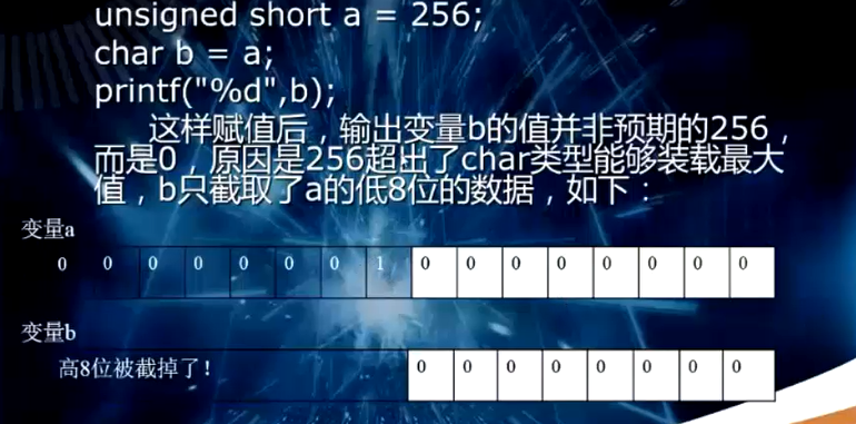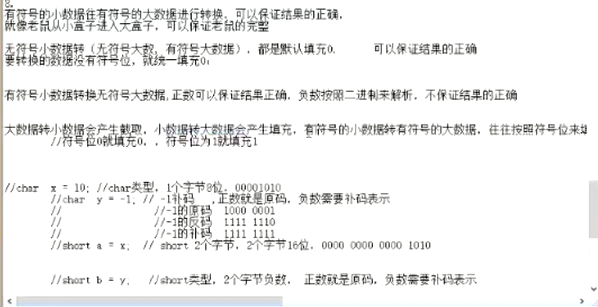 类型间转换:不同类型的整型数据所占的字节数不同,他们在相互转换时需要格外留心,不要把过大的数据放在过小的数据类型中,在把占字节较大的数据赋值给占字节较小的数据时,防止出现以下的情况。