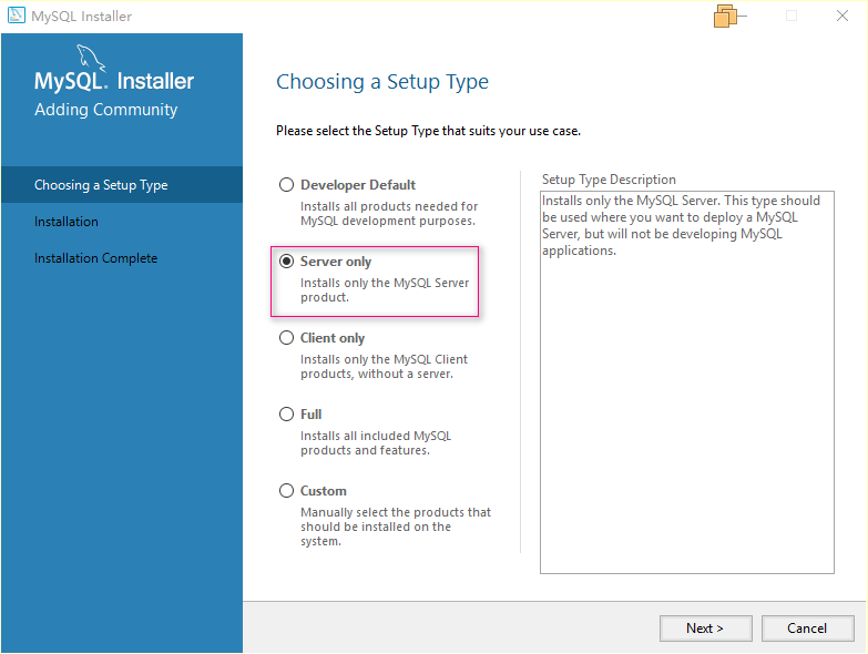 步骤1、选择Server only,安装服务版,点击Next进行下一步