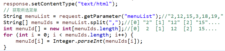 String menuList = request.getParameter("menuList");//"2,12,15,3,18,19,"