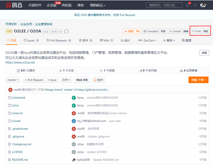 1、访问O2OA项目的[码云]Gitee仓库:https://gitee.com/o2oa/O2OA