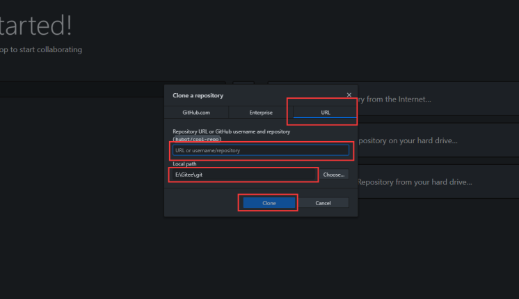 2)在弹出的Clone a repository对话框里选择URL选项卡,填写URL和Clone到的本地地址后,点击Clone即可开始Clone项目源码: