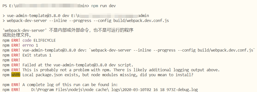 今天在执行npm run dev启动项目时遇到'webpack-dev-server' 不是内部或外部命令,也不是可运行的程序 或批处理文件。这个问题