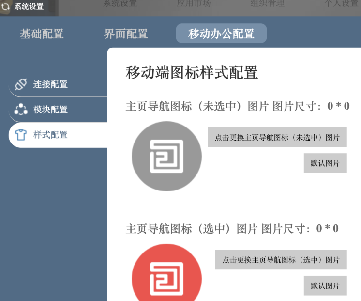 App内看到的一些O2OA相关的logo图标,可以不编译打包进App,我们服务端可以进行动态配置。用管理员进入我们O2OA的服务端,找到系统设置->移动办公配置->样式配置,就可以修改图标了: