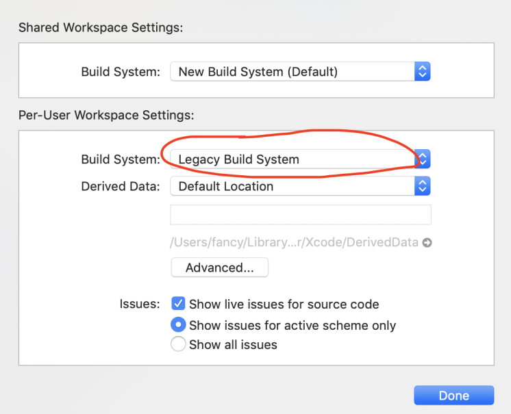 在项目根目录找到 O2Platform.xcworkspace ,双击打开项目。 在XCode中找到菜单 : File -> Workspace Settings ... 修改Build System 选项为 Legacy Build System