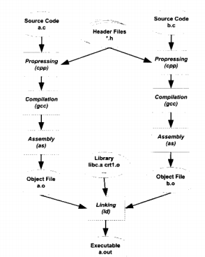 实际上gcc命令只是这些后台程序的包装,它会根据不同的参数要求去调用预编译编译程序cc1、汇编器as、链接器ld