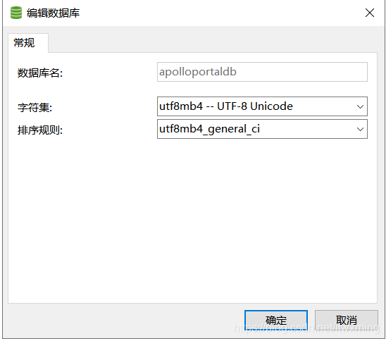 在Mysql数据库中新增两个数据库:apolloconfigdb和apolloportaldb,字符集及排序规则如下: