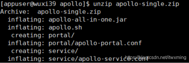 上传快速部署版本(apollo-single.zip)到/home/appuser/apollo目录下并解压: