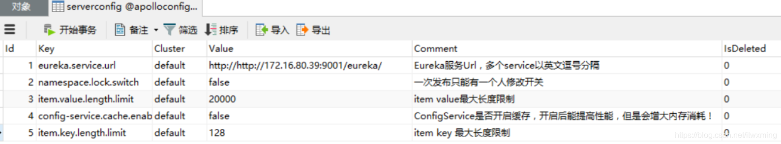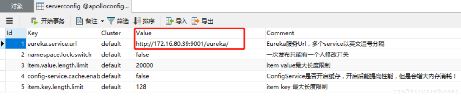 apolloconfigdb数据库的serverconfig表中,key为eureka.service.url数据的value值改为config-service的地址,如http://172.16.80.39:9001/eureka/修改