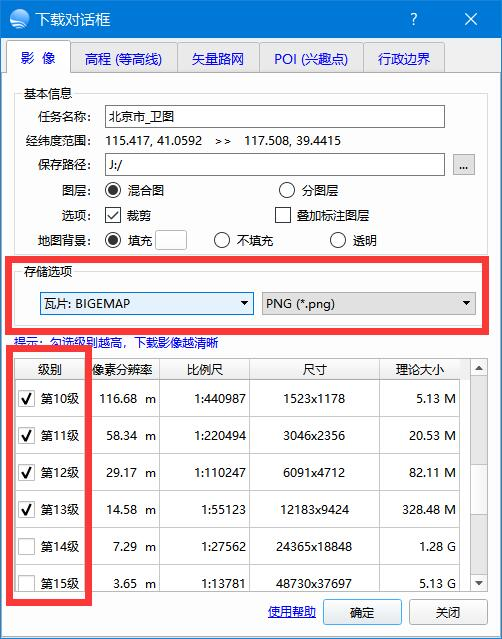 以上图所示:1、此处需要选择:瓦片:BIGEMAP;后面的网片格式选择png、jpg都可以。