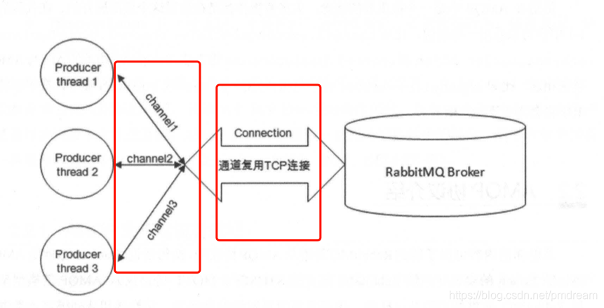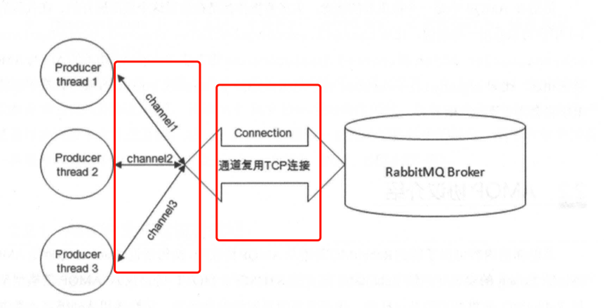 注意是一个TCP 被多个线程共享,每个线程对应一个信道,信道在rabbit都有唯一的ID,保证了信道的私有性,对应上唯一的线程使用。