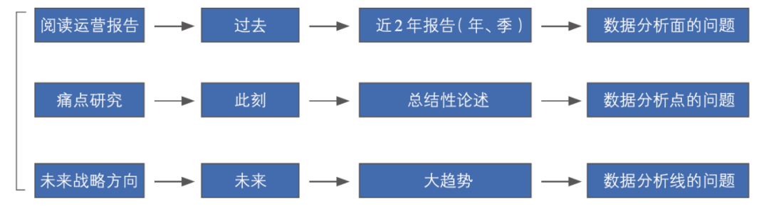 不过在一般情况下,我们可以把数据分析的需求分为三个大的部分:运营报告的阅读、痛点研究、未来战略方向。 数据分析的需求来源如下图所示。