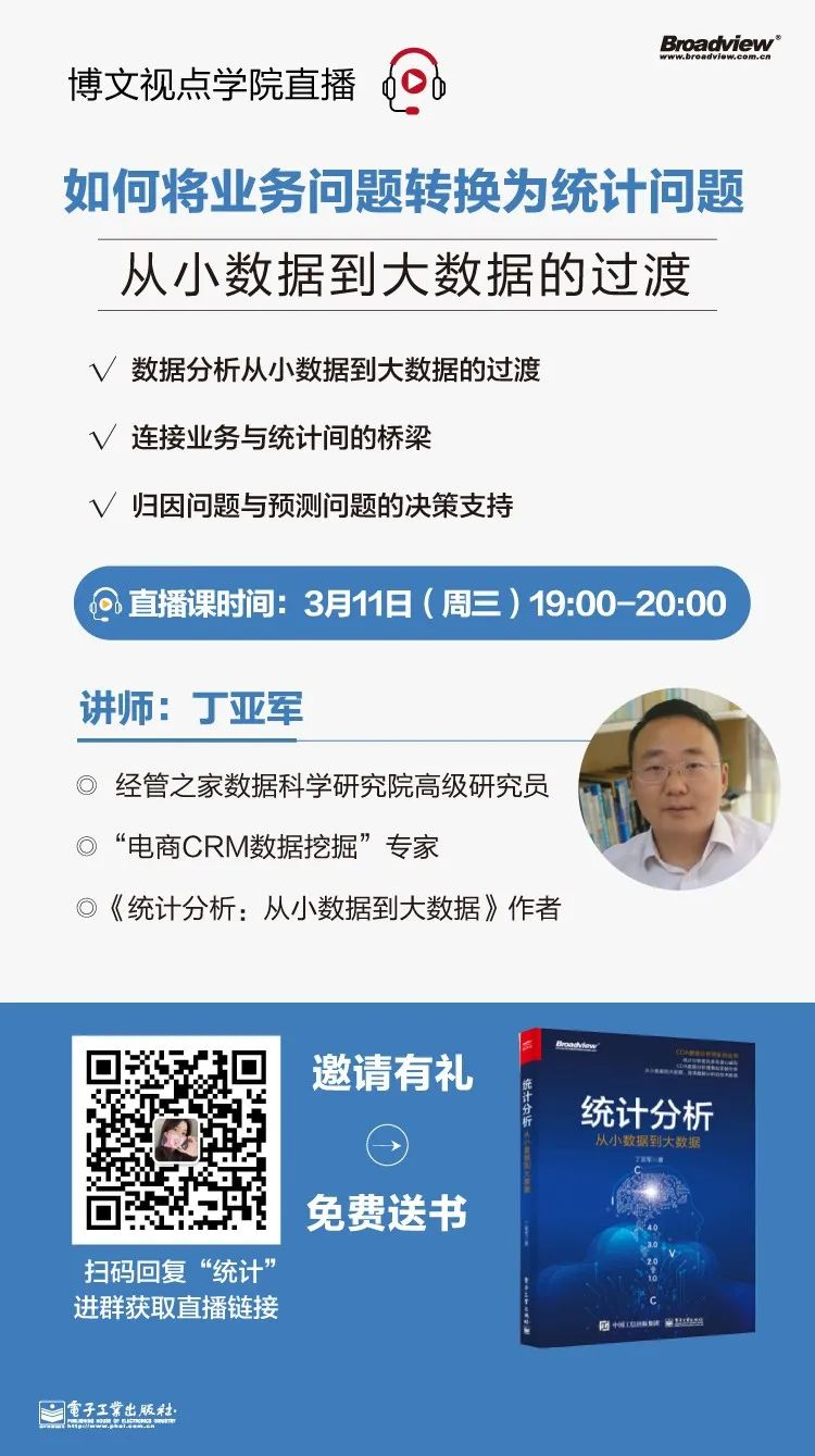为了帮助大家更好的解决上述问题。我们有幸邀请到了《统计分析:从小数据到大数据》等书作者、经管之家数据科学研究院高级研究员丁亚军老师,合力打造一堂免费直播公开课!