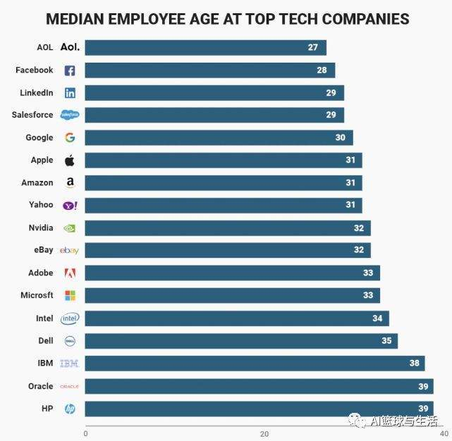 讲完了中国互联网圈子里的情况,我们来聊聊大洋彼岸的美国,尤其是在硅谷,35岁以上又是什么样子的存在么?近年来,在美国硅谷,对年龄的偏见也变得越来越“明显”,但是和中国的互联网圈子相比,美国的职场整体上要对35岁以上的程序员要友善许多。但是与此同时,小编也不得不承认的是,硅谷对于年轻人的喜爱在与日俱增,小编整合出来一张美国主流科技公司员工的中位数年龄分布图: