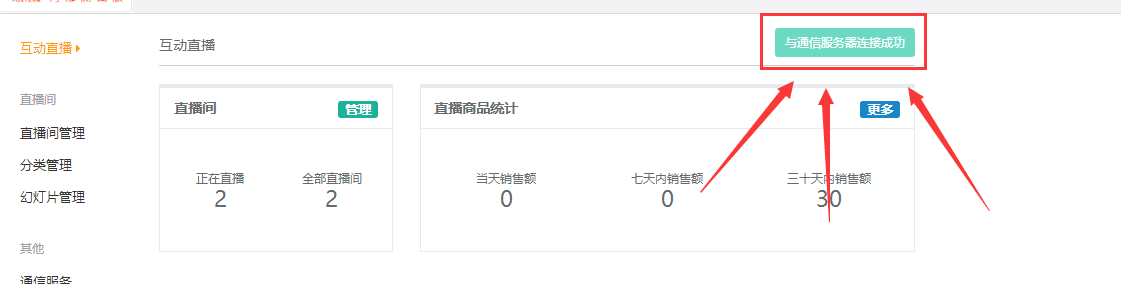 在商城互动直播的后台查看是否成功连接服务