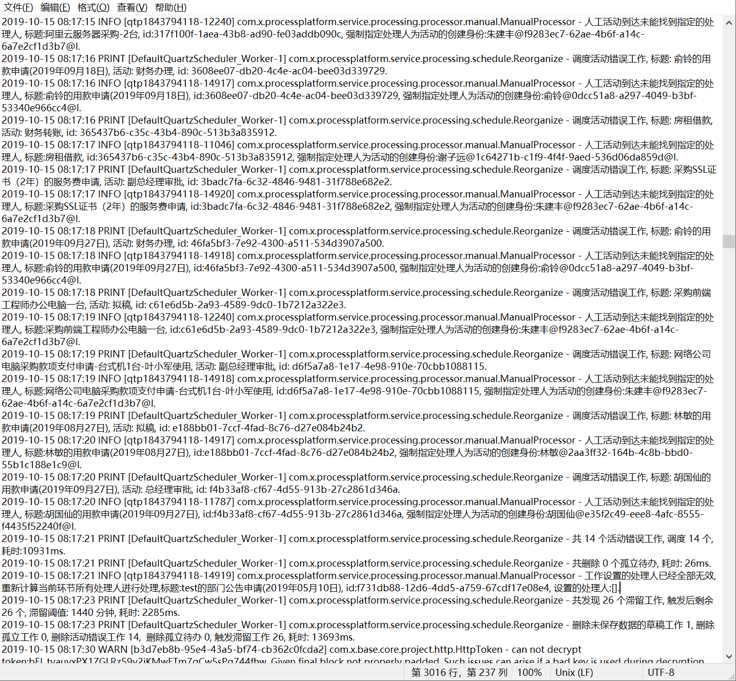 2019-10-15 08:17:11 PRINT [DefaultQuartzScheduler_Worker-1] com.x.processplatform.service.processing.schedule.Reorganize - 调度活动错误工作, 标题: 胡国仙的用款申请(2019年09月29日), 活动: 总经理审批, id: 14462817-5795-4d2e-a5bd-a13442c6c7f0.分日志内容