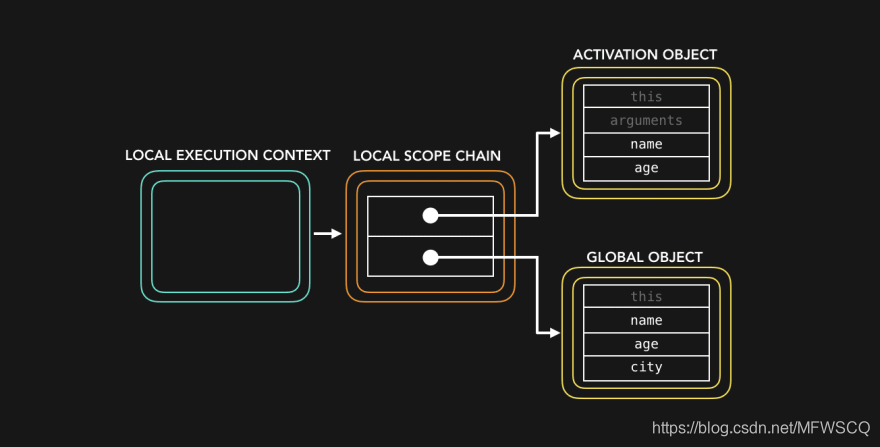 不过,在这篇文章中,我一般不会讨论激活对象或执行上下文,我们只关注作用域吧!在下面的示例中,执行上下文中的键/值对表示作用域链对变量的引用。
