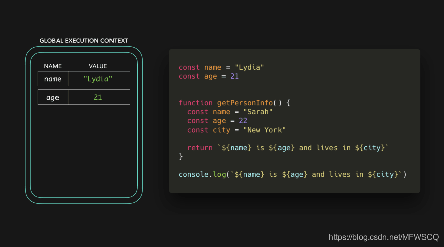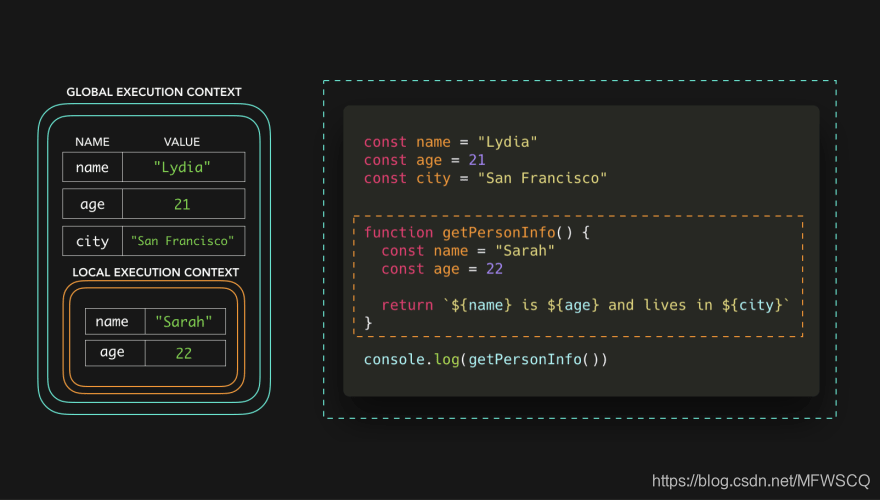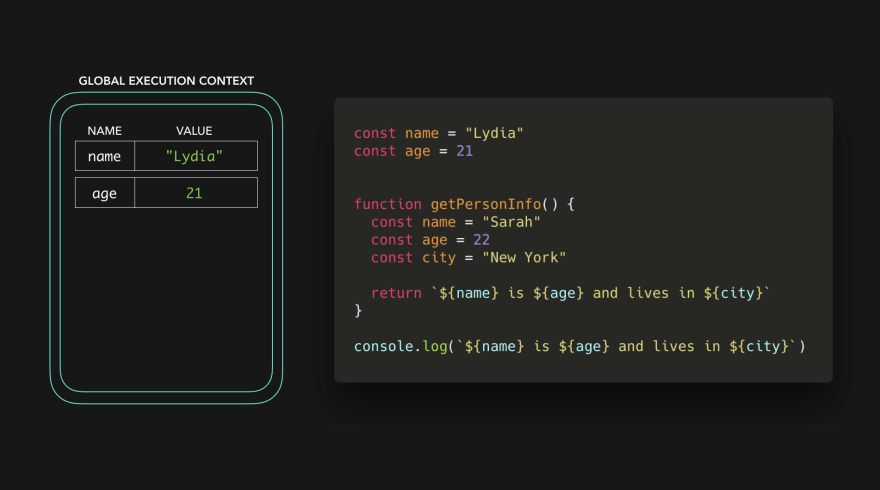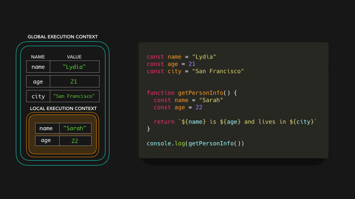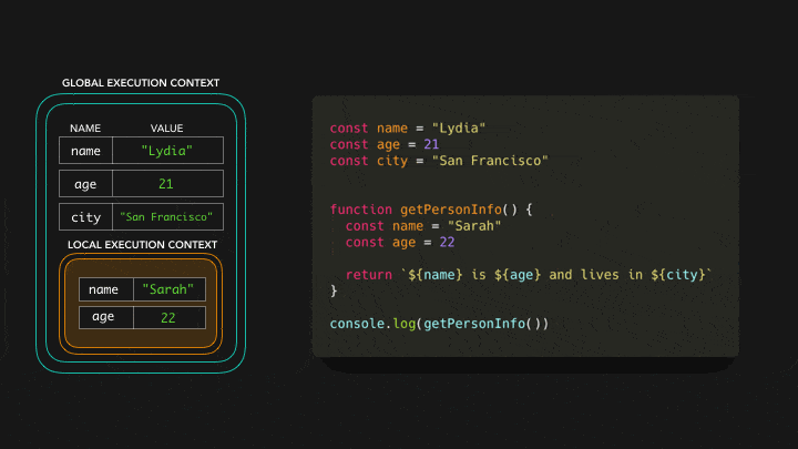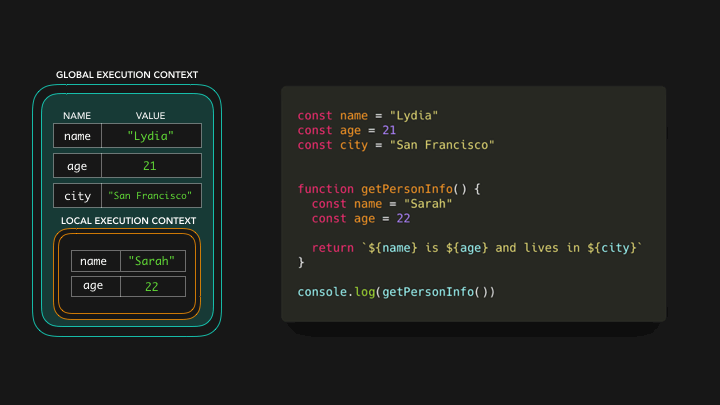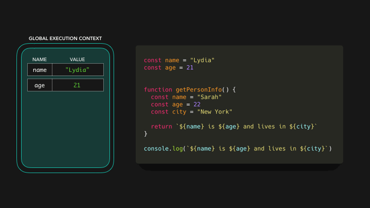 在全局上下文中,我们用San Francisco的值来声明变量city,从而对变量city有一个引用。现在我们有了变量的值,函数getPersonInfo可以返回字符串Sarah is 22 and lives in San Francisco 🎉