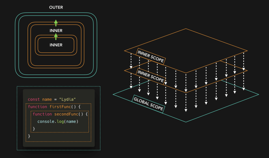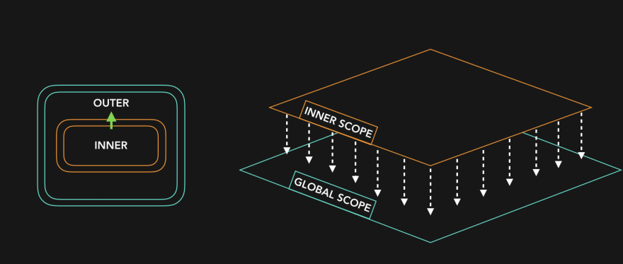 我们可以沿着范围链往下走,但不能沿着范围链往上走。(好吧,这可能会让人困惑,因为有些人会说“向上”而不是“向下”,所以我要重新表述一下:你可以到外部的范围,但不能到更内部的范围。。。(内部…)范围。我喜欢把它想象成瀑布: