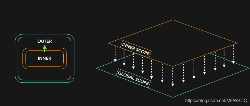 - 作用域还可以重用作用域链下游(外部)定义的变量名,因为它只能向下延申(外部)作用域链,而不能向上延申(内部)作用域链。