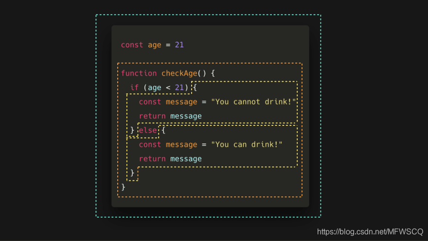 在ES5中我们只有全局作用域和函数作用域,ES6新增了块级作用域,现在我们有一个全局作用域、一个函数作用域和两个块作用域。我们能够声明变量消息两次,因为变量的作用域是花括号。