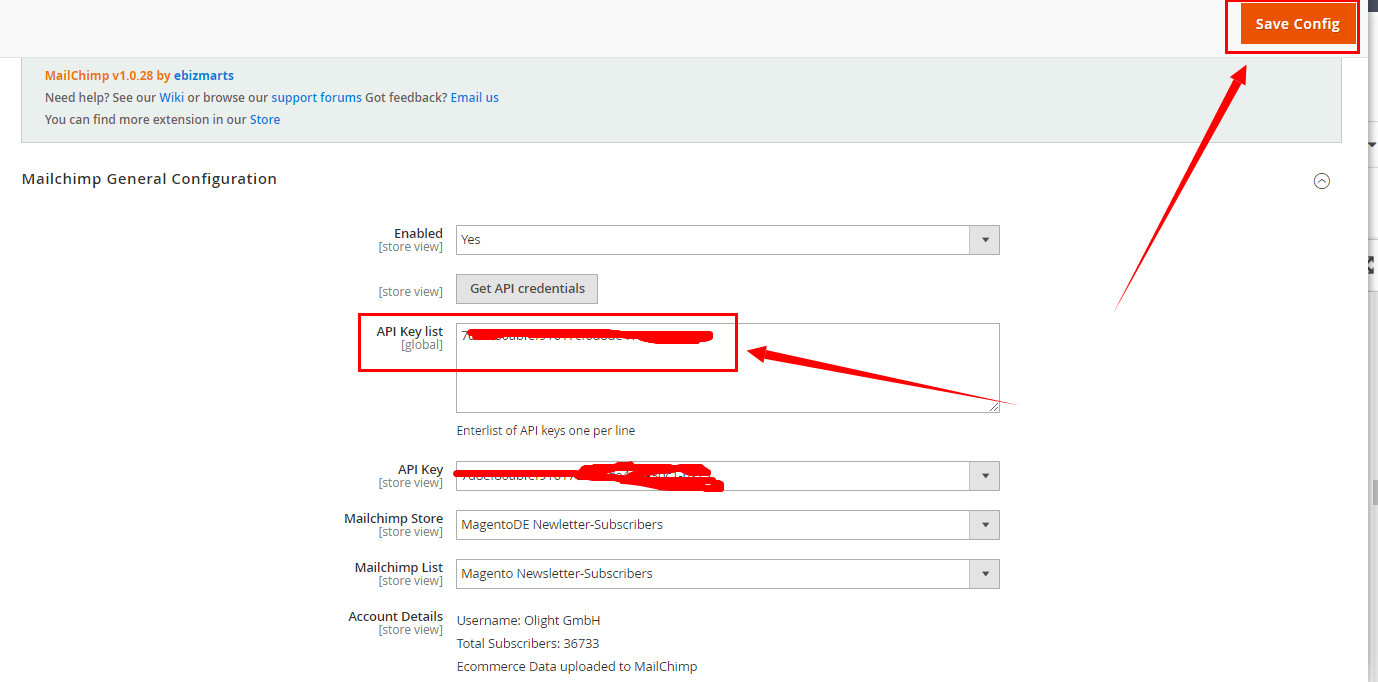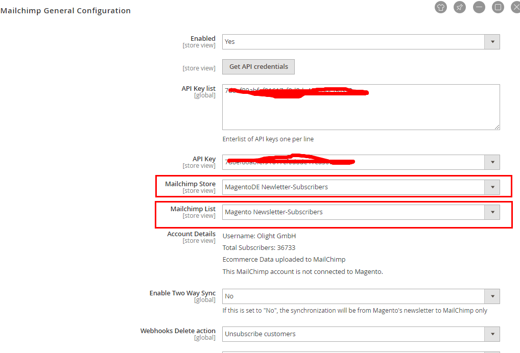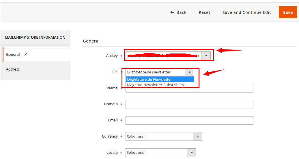 备注:在Mailchimp Store里,选择刚才创建的mailchimp store。Mailchimp List会自动出来,若不出来,再手动选择。