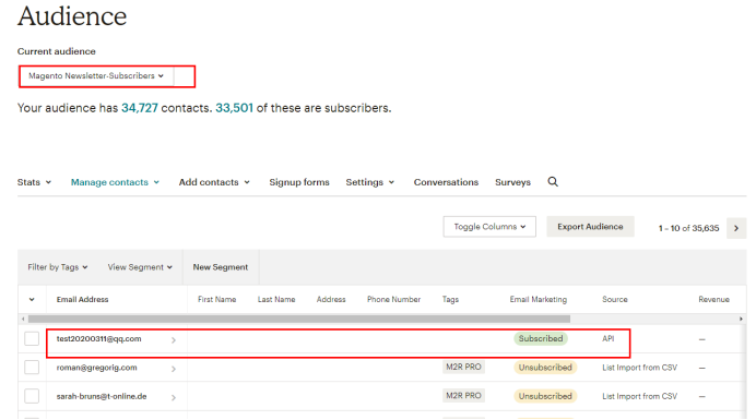 2、返回mailChimp的当前Audience,查看是否有上述邮箱(有时要等个10分钟)