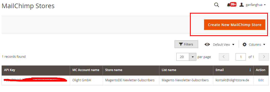 点击 "Create New MailChimp Store" 创建新的mailchimp store。