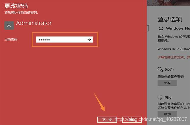 然后会跳出一个窗口,我们先输入【当前密码】,也就是你一开始自己设置的原始密码。点击下一步。