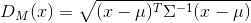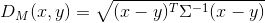 其中Σ是多维随机变量的协方差矩阵,μ为样本均值,如果协方差矩阵是单位向量,也就是各维度独立同分布,马氏距离就变成了欧氏距离。