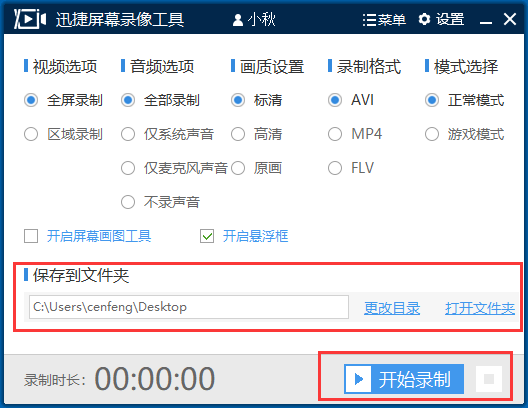 相关参数修改完毕后点击右下方的开始录制按钮就可以根据参数对当前屏幕进行录制,当内容录制完毕后点击右下角的矩形框就可以把录制的视频文件保存到上方所示目录下。
