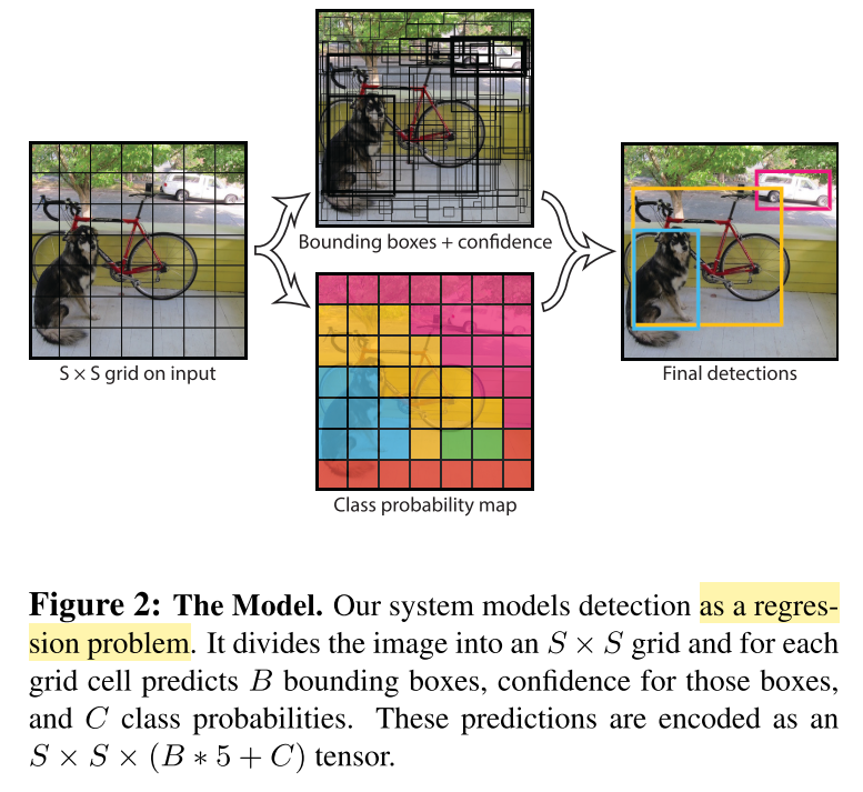 将图像划为s*s的网格,物体的中心处于哪个网格,哪个网格负责检测该物体。每个网格预测B个bbox,每个bbox预测5个值,x,y,w,h,c(c为置信度)。其中,x,y为物体中心点相对于对应网格左上角的偏移量,归一化为0~1,w,h是相对整张图大小归一化后的值,范围是0~1,c是P(obj)*IOU(truth&pred),体现是否有物体及预测准确度两个含义。每个网格还会预测C个条件类别概率。对于SxS个网格,每个网格要预测B个bounding box还要预测C个categories。输出就是S x S x (5*B+C)的一个tensor。