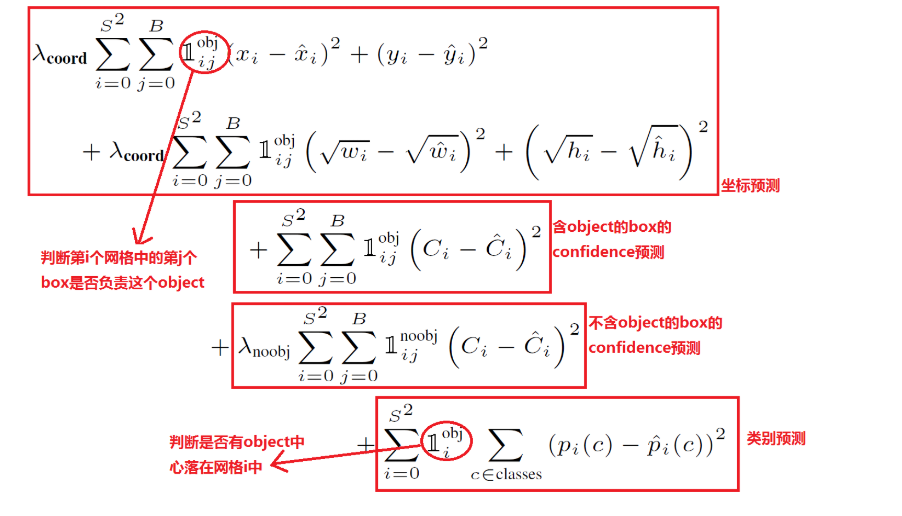 YOLOv2和YOLOv1的损失函数一样,为均方差函数。但是我看了YOLOv2的源码(训练样本处理与loss计算都包含在文件region_layer.c中,YOLO源码没有任何注释,反正我看了是直摇头),并且参考国外的blog以及allanzelener/YAD2K(Ng深度学习教程所参考的那个Keras实现)上的实现,发现YOLOv2的处理比原来的v1版本更加复杂。先给出loss计算公式: