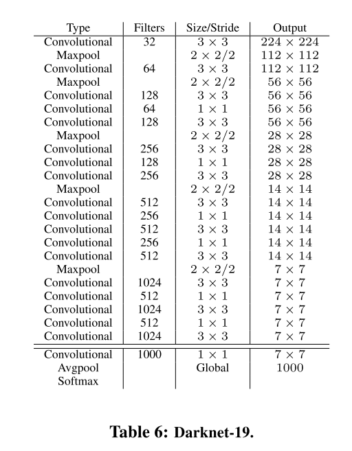 YOLOv2采用了一个新的基础模型(特征提取器),称为Darknet-19,包括19个卷积层和5个maxpooling层,如图4所示。Darknet-19与VGG16模型设计原则是一致的,主要采用3*3卷积,采用2*2的maxpooling层之后,特征图维度降低2倍,而同时将特征图的channles增加两倍。与NIN(Network in Network)类似,Darknet-19最终采用global avgpooling做预测,并且在3*3卷积之间使用1*1卷积来压缩特征图channles以降低模型计算量和参数。Darknet-19每个卷积层后面同样使用了batch norm层以加快收敛速度,降低模型过拟合。在ImageNet分类数据集上,Darknet-19的top-1准确度为72.9%,top-5准确度为91.2%,但是模型参数相对小一些。使用Darknet-19之后,YOLOv2的mAP值没有显著提升,但是计算量却可以减少约33%。