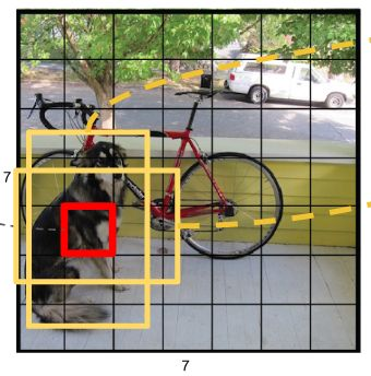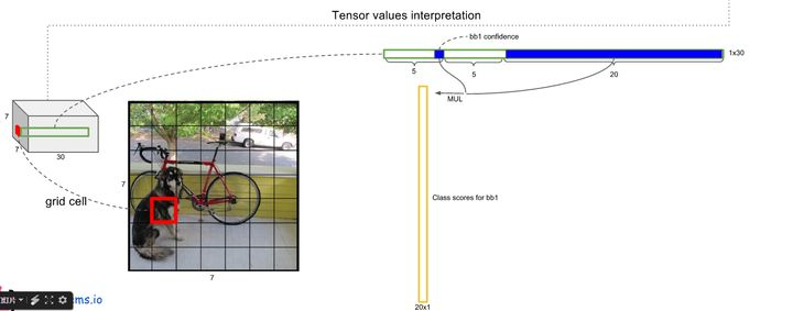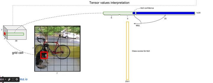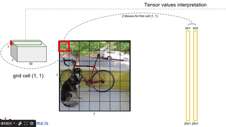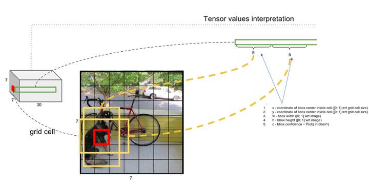 - 每个网格还要预测类别信息,论文中有20类。7x7的网格,每个网格要预测2个 bounding box 和 20个类别概率,输出就是 7x7x(5x2 + 20) 。 (通用公式: SxS个网格,每个网格要预测B个bounding box还要预测C个categories,输出就是S x S x (5*B+C)的一个tensor。 注意:class信息是针对每个网格的,confidence信息是针对每个bounding box的)