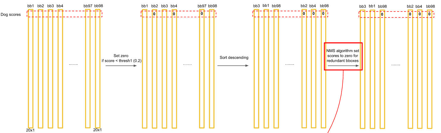得到每个box的class-specific confidence score以后,设置阈值,滤掉得分低的boxes,对保留的boxes进行NMS处理,就得到最终的检测结果。