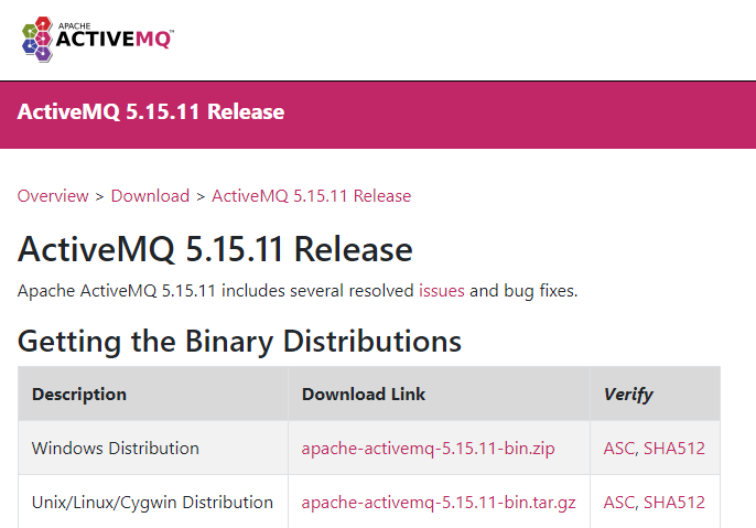 进入activemq官网,选择合适的版本下载(分别对应linux):http://activemq.apache.org/download-archives.html