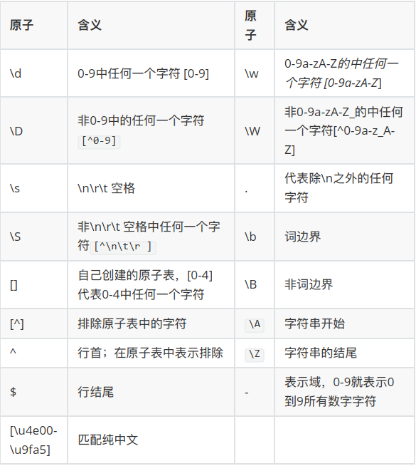 - 原⼦ 组成正则表达式的最⼩单位,任何字符都可以