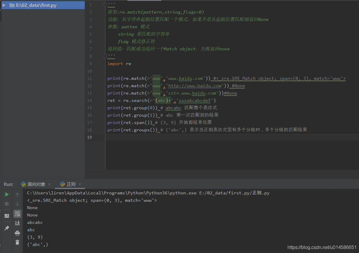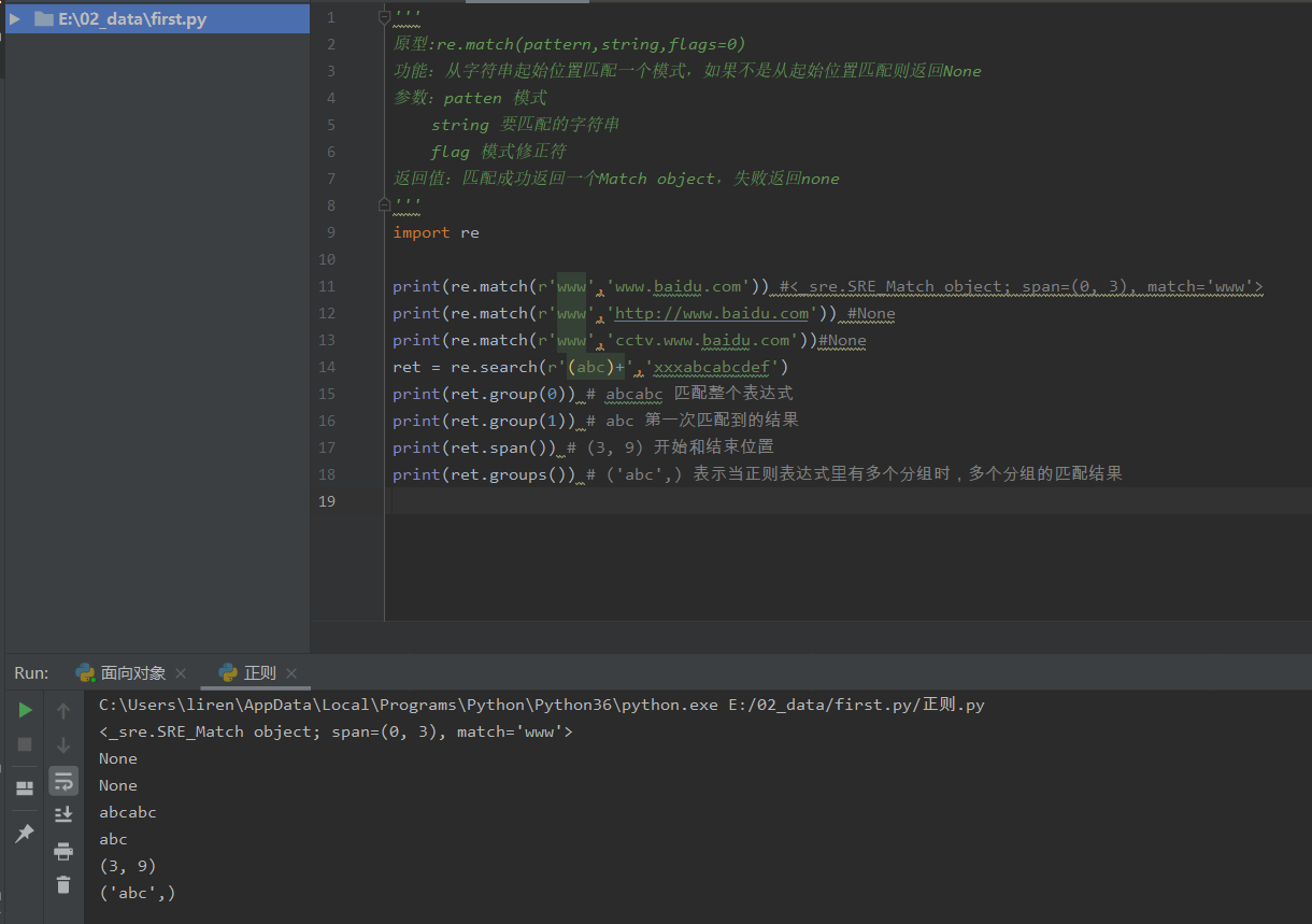 - 模式字符串⼀定要使⽤原⽣字符串,也就是⽤r开头的字符串。 r'www'