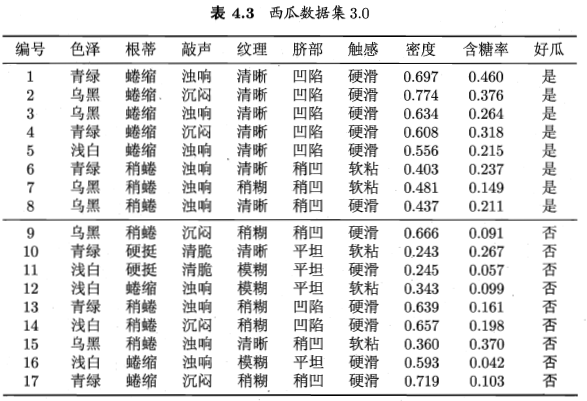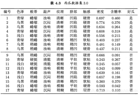 接下来,我们直接看个例子,以西瓜书上的例子来看: