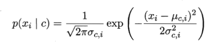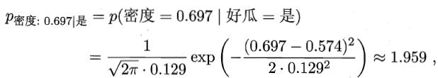 P(色泽=青绿 | 好瓜) 就是在好瓜的前提下,色泽是青绿的概率,我们可以从训练集中看出,有8个是好瓜,其中色泽青绿的有3个,所以P(色泽=青绿 | 好瓜) = 3/8,同理,P(根蒂=蜷缩 | 好瓜) 、 P(敲声=浊响 | 好瓜) 、 P(纹理=清晰 | 好瓜) 、 P(脐部=凹陷 | 好瓜)这些都可以算出来。然而,P(密度=0.697 | 好瓜) 和 P(含糖率=0.460 | 好瓜) 涉及到了连续属性,就不单单是简单的像离散属性那样统计个数那么简单。所以引入了高斯分布,其大意就是,在同一类别中,连续属性的属性值符合某一正态分布: