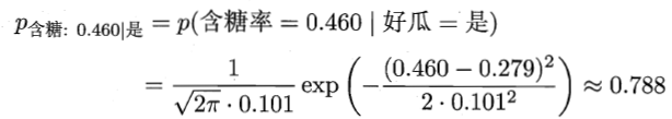 P(色泽=青绿,根蒂=蜷缩,敲声=浊响,纹理=清晰,脐部=凹陷,密度=0.697,含糖率=0.460,好瓜) / P(色泽=青绿,根蒂=蜷缩,敲声=浊响,纹理=清晰,脐部=凹陷,密度=0.697,含糖率=0.460) =