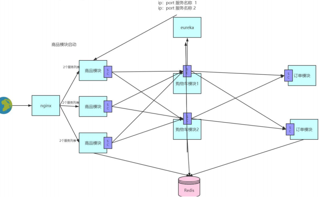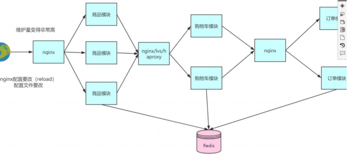 这种架构貌似暂时解决了我们的问题,但是用户量慢慢增加后,我们只能通过横向加机器来解决,还是会存在版本迭代慢,代码维护困难的问题。而且用户请求往往是读多写少的情况,所以可能真正需要扩容的只是商品模块而已,而现在是整个工程都扩容了,这无形中是一种资源的浪费,因为其他模块可能根本不需要扩容就可以满足需求。所以我们有必要对整个工程按照模块进行拆分,拆分后的架构图如下: