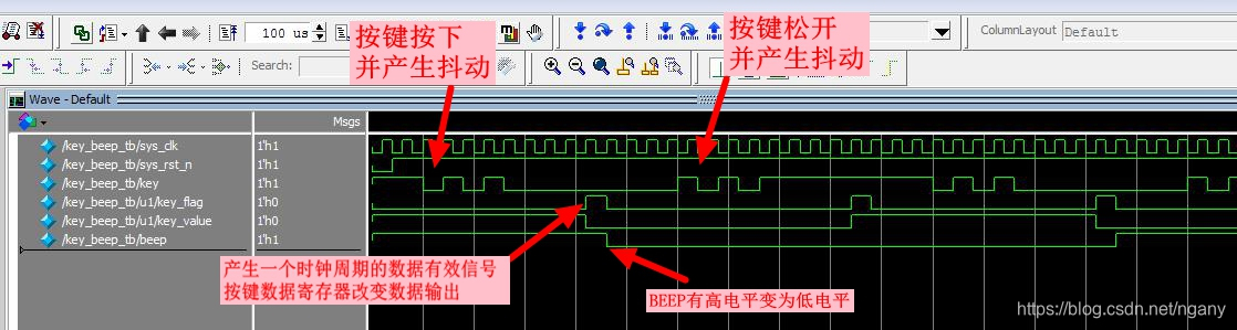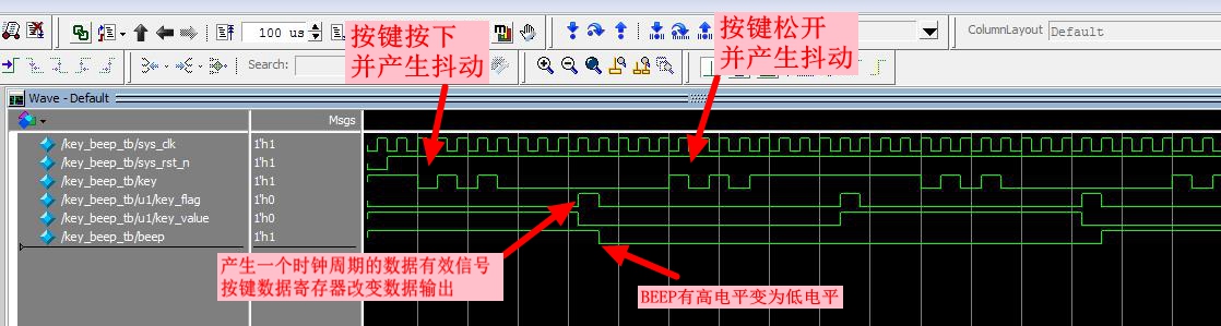 思路:一直检测按键状态,一旦按键状态发现变化,给delay_cnt计数器赋初值100_0000,也就是20ms计数。按键状态不发生改变,那么计数器开始递减计数,直到计数器减到1时,说明按键状态稳定保持20ms,此时给出一个时钟周期的按键有效通知信号key_flag,并将按键数据寄存器key_value锁存输出。