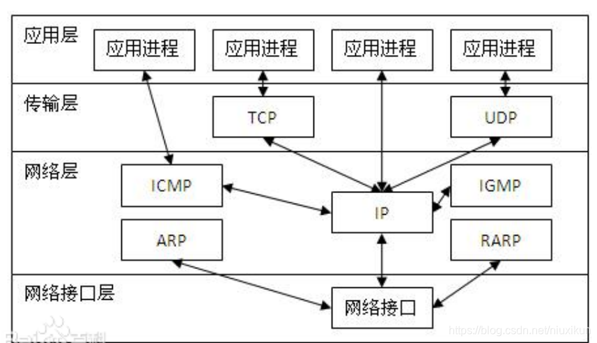 模型方面来讲,TCP/IP 由四个层次组成:网络接口层、网络层、传输层、应用层。