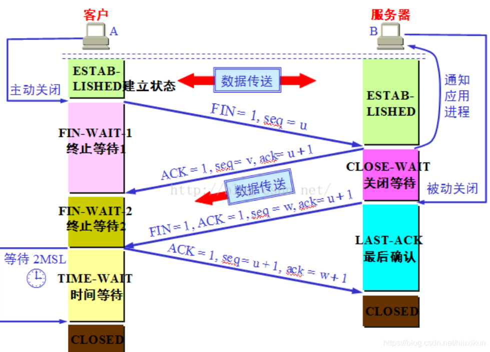 然后等待服务器的确认。其中终止标志位 FIN=1,序列号 seq=u