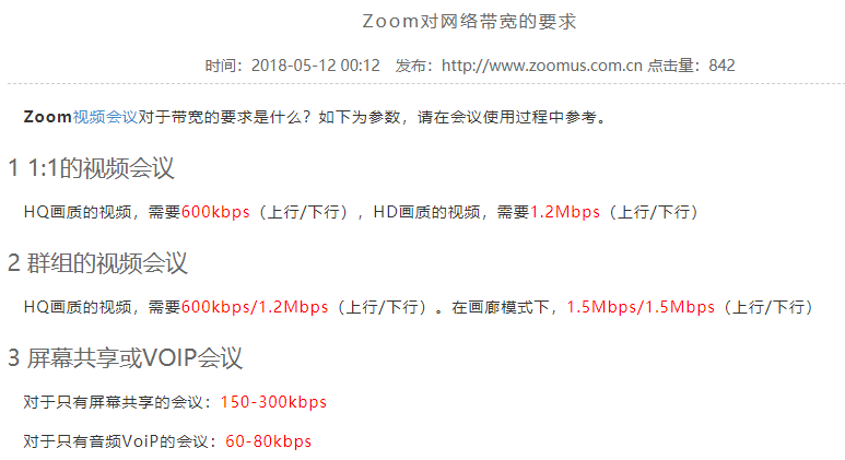 以下是Zoom视频会议对于带宽的要求,大家可以对比下。