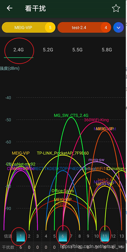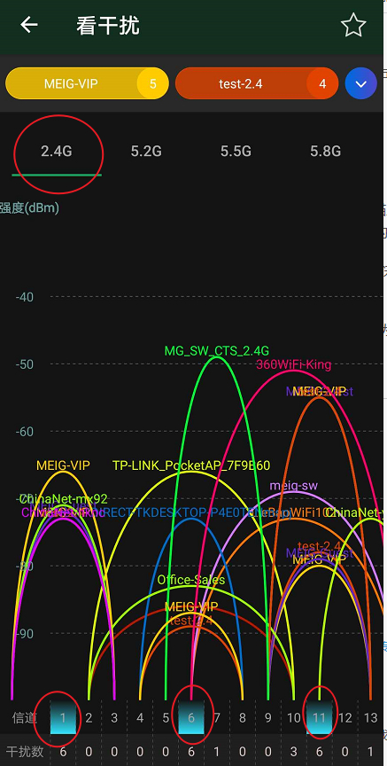 wifi有多个信道,注意避免附近(邻居)使用的信道。查看附近wifi使用的信息的方法为下载 “wifi魔盒"APK,进入魔盒菜单-》看干扰 界面,下图中可以看到我当前所处的环境中1、6、11信道有较多的干扰,可以在wifi路由器中配置选择其它的信道。
