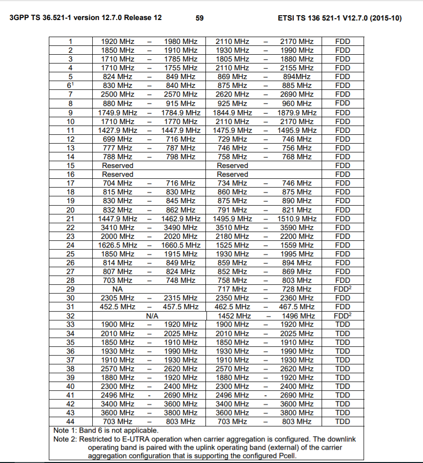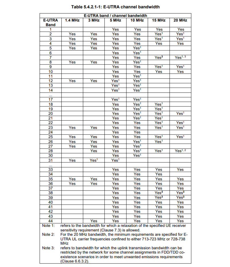 2.LTE有6种信道(channel)带宽,分别是1.4M 3M 5M 10M 15M 20M,不同的BAND支持其中的几种或者全部6种信道带宽。详情如下表